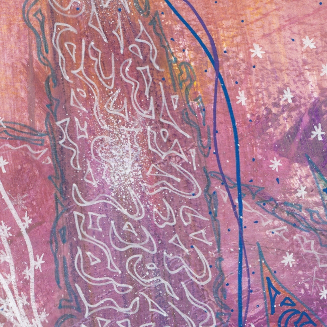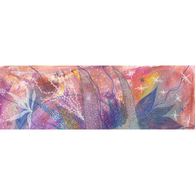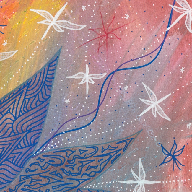 Cette peinture nous amène dans un monde mystérieux et cosmique, à la fois intime et relié au tout.