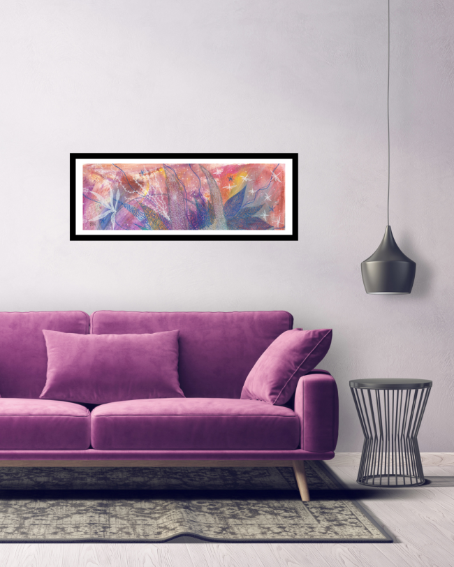 Portée par l'énergie d'un dragon de cristal, cette peinture est douce et puissante à la fois. Elle nous offre un espace de rechargement, et nous ouvre les portes d'un monde de pureté, de joie et d'abondance.