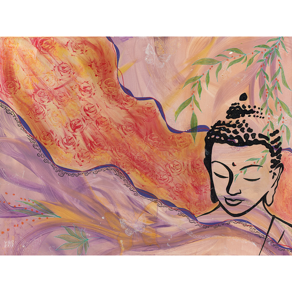 Cette peinture est une rencontre des énergies de Bouddha et de la Rose. Deux énergies puissantes qui nous offrent un espace d'amour, de plénitude, d'apaisement, d'ouverture du cœur, de protection, et bien plus encore.